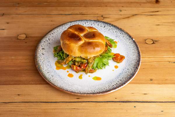 Z mięsem wołowym lub z kotletem wegańskim z bobu (do wyboru), pomidorem malinowym, sałatą lodową, aioli dijon, pikantnym warzywnym relishem i sosem BBQ, podawany z frytkami
