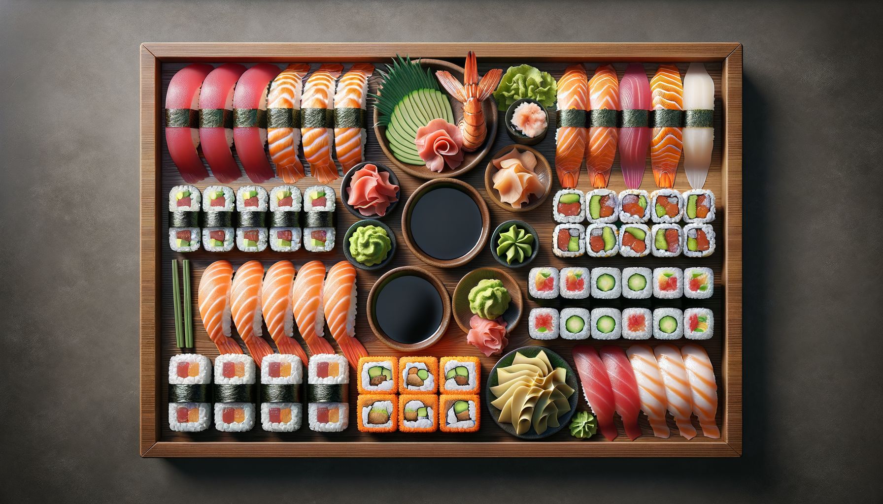 futomaki z chrupkami z tempury i opalanym łososiem, uramaki karmazyn w tempurze z chrustem z surimi, hosomaki z ogórkiem, hosomaki z chrupkami z tempury, wliczona ustawowa opłata recyklingowa