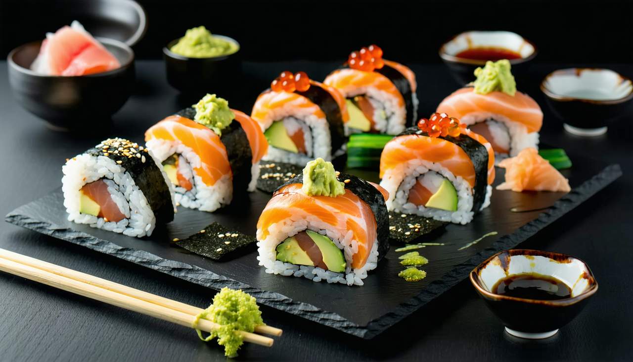 10 x Futomak łosoś pieczony, serek, ogórek, rzepa, tykwa całość zapieczona w panko, sos sweet chili, sezam 10 x California, ogórek, rzepa, tykwa całość obłożona łososiem, pulpa mango, truskawki, wiórki kokosowe 10 x hosomak, ogórek, rzepa, tykwa całość zapieczona w panko na górze kwiatki z serka, papryka, koperek