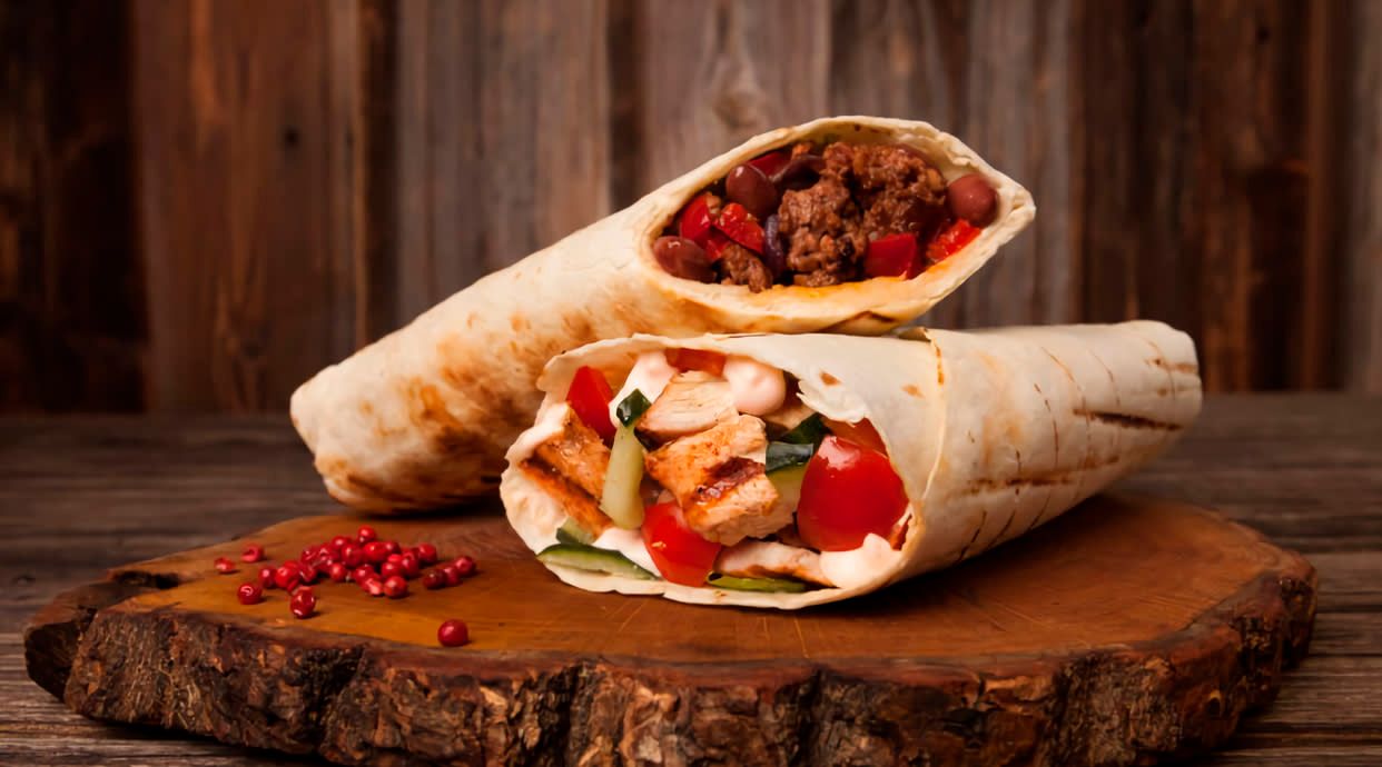Mięso z kurczaka , surówka, ogórki, pomidory, cienki pita , sos