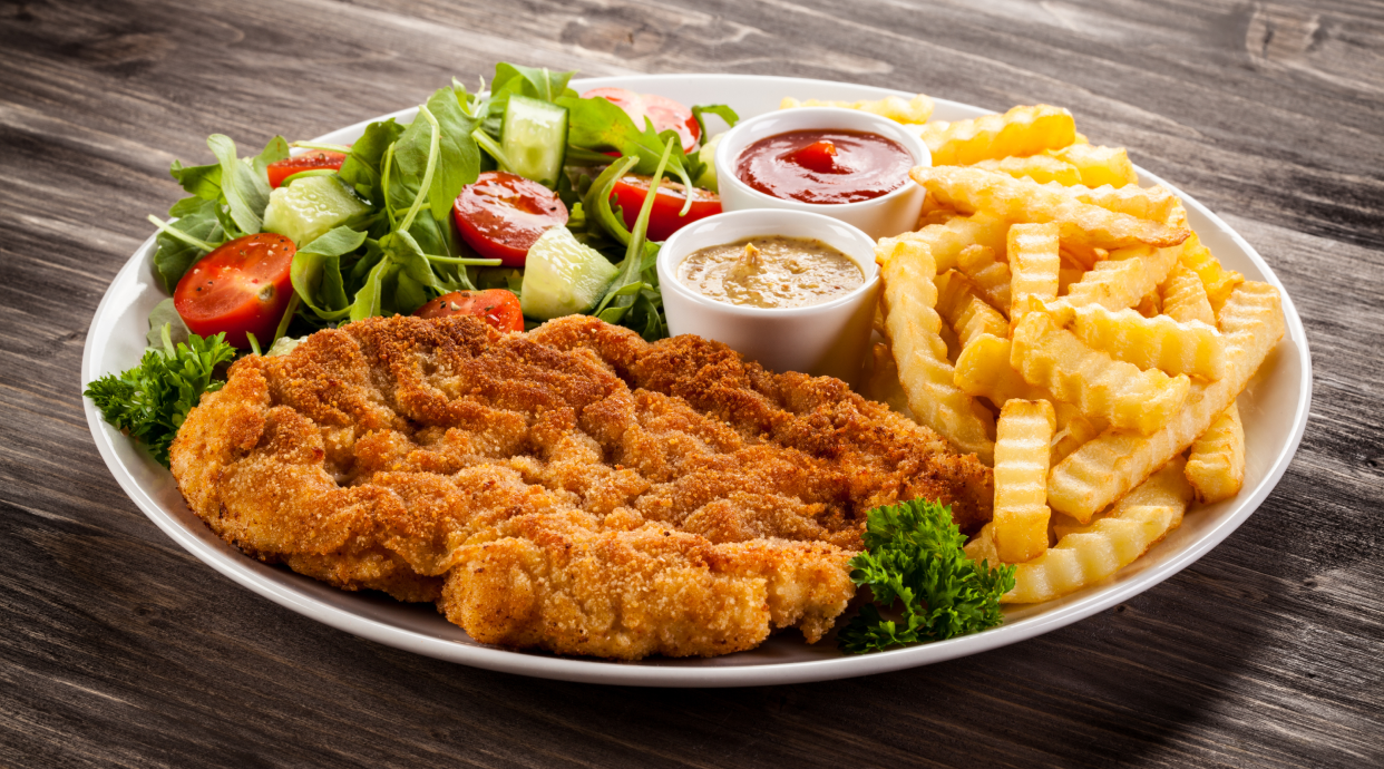 Sznycel z frytkami i sałatką