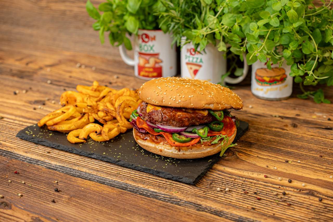 100% wołowina (200g), bułka pszenna, mix sałat, ser cheddar, pomidor, cebula, ogórek konserwowy, ketchup, sos majonezowy, Frytki zakręcone (250g)