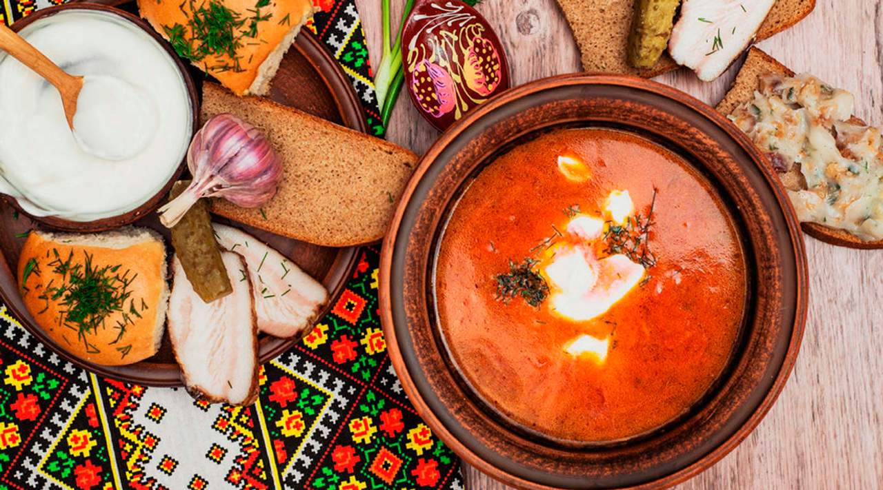 Barszcz ukraiński tradycyjny z pampuchą, śmietaną, słoniną i cebulą