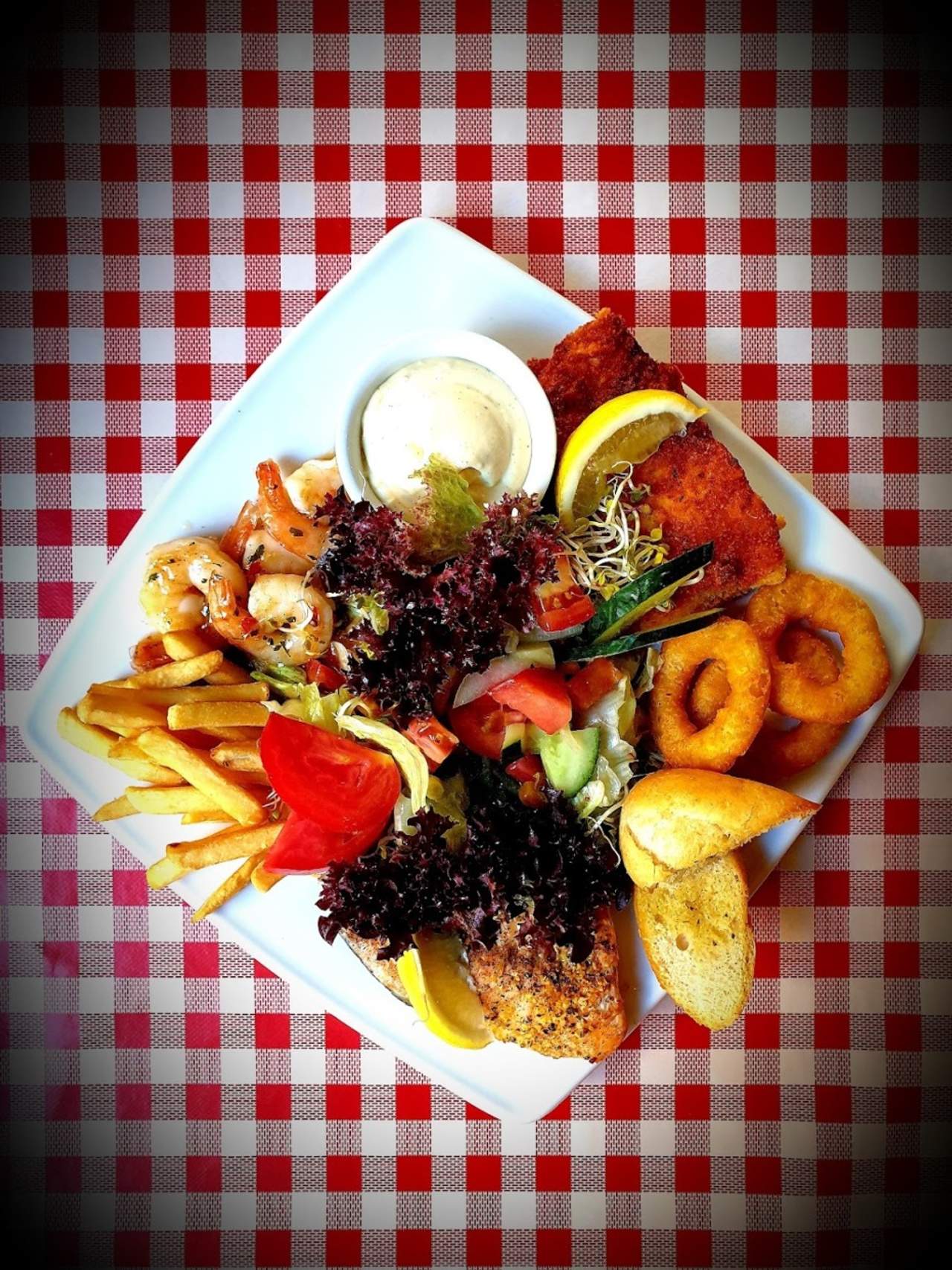 łosoś, dorsz panierowany, kalmary, krewetki, ziemniaki opiekane, surówka sezonowa, chleb czosnkowy, sos czosnkowy