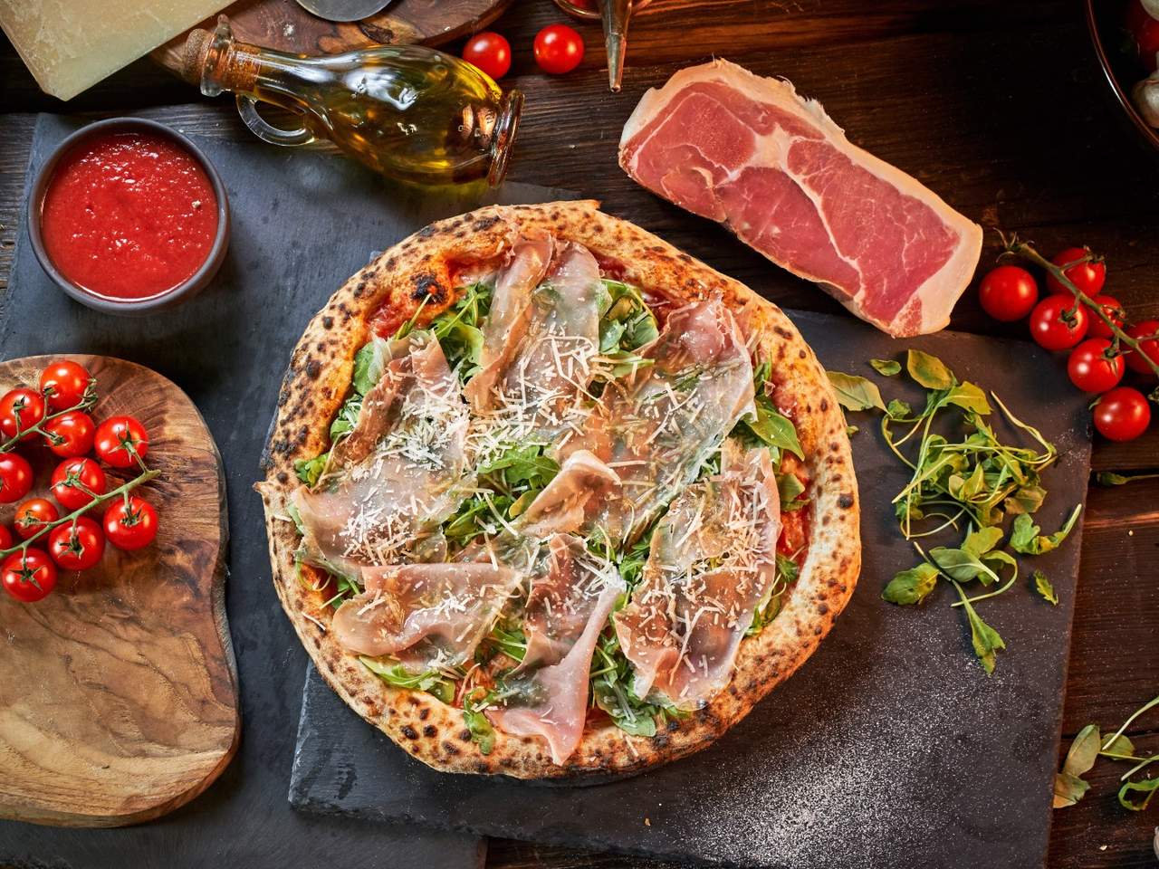 pomidory San Marzano D.O.P, mozzarella Julliene valcolatte, prosciutto crudo (szynka długodojrzewająca), rukola, parmigiano reggiano D.O.P