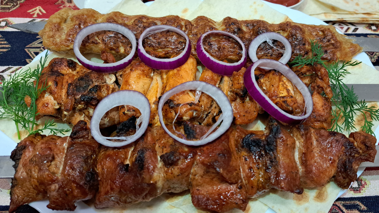 Shishkebab (mięso jagnięce grillowane na szpadzie), podany z lawaszem