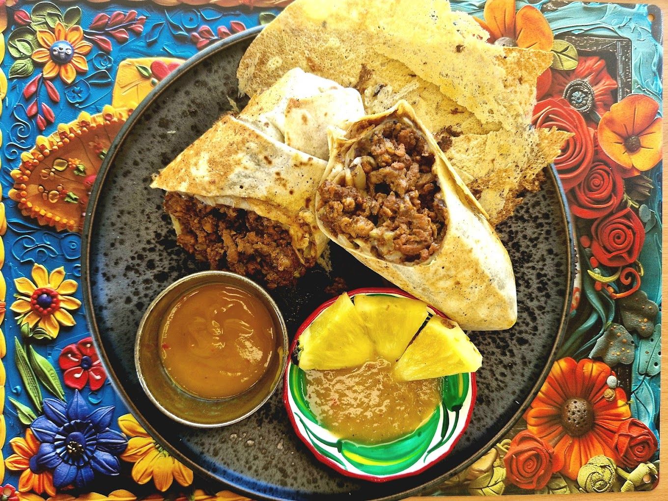 Wieprzowina marynowana w soku z wyciskanych pomarańczy, grillowany ananas, sałata, pasta z czarnej fasoli, cebula i żółty ser.