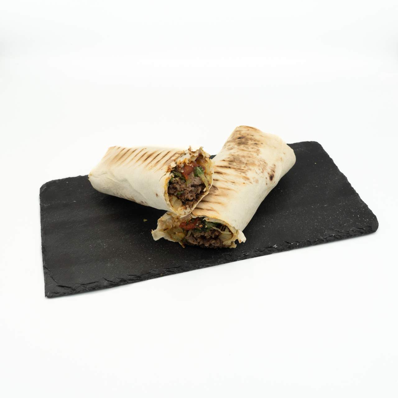 Mięso z wołowiny i kurczaka owinięte lawaszem, pomidor, sałata lodowa, cebula