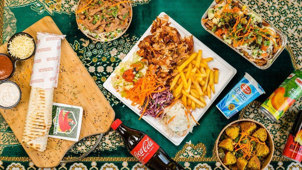 Mięso do wyboru, frytki, warzywa i sos w zestawie talerzowym.Klasyczny kebabowy zestaw z napojem i baklawą.