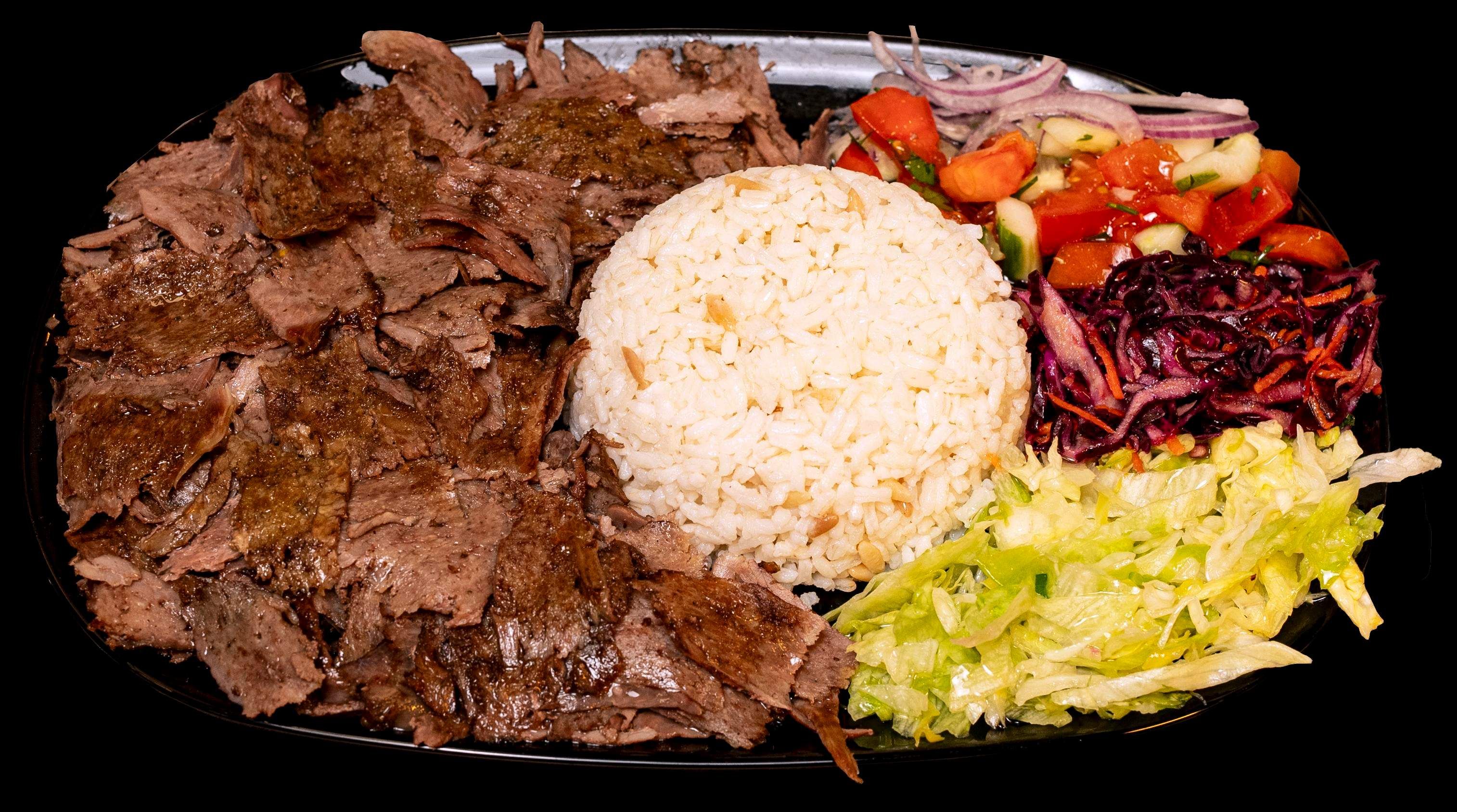 Opiekane mięso baranio-wołowe i kurczak, dodatek do wyboru: frytki, ryż, kasza bulgur, ziemniaki opiekane, warzywa, sos, napój