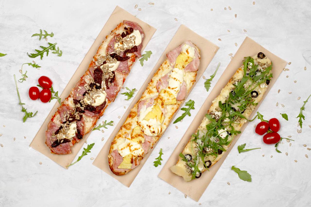 - Rzemieślnicza bagietka - Sos pomidorowy - Mozzarella - Pomidor - Cebula - Feta - Oliwki
