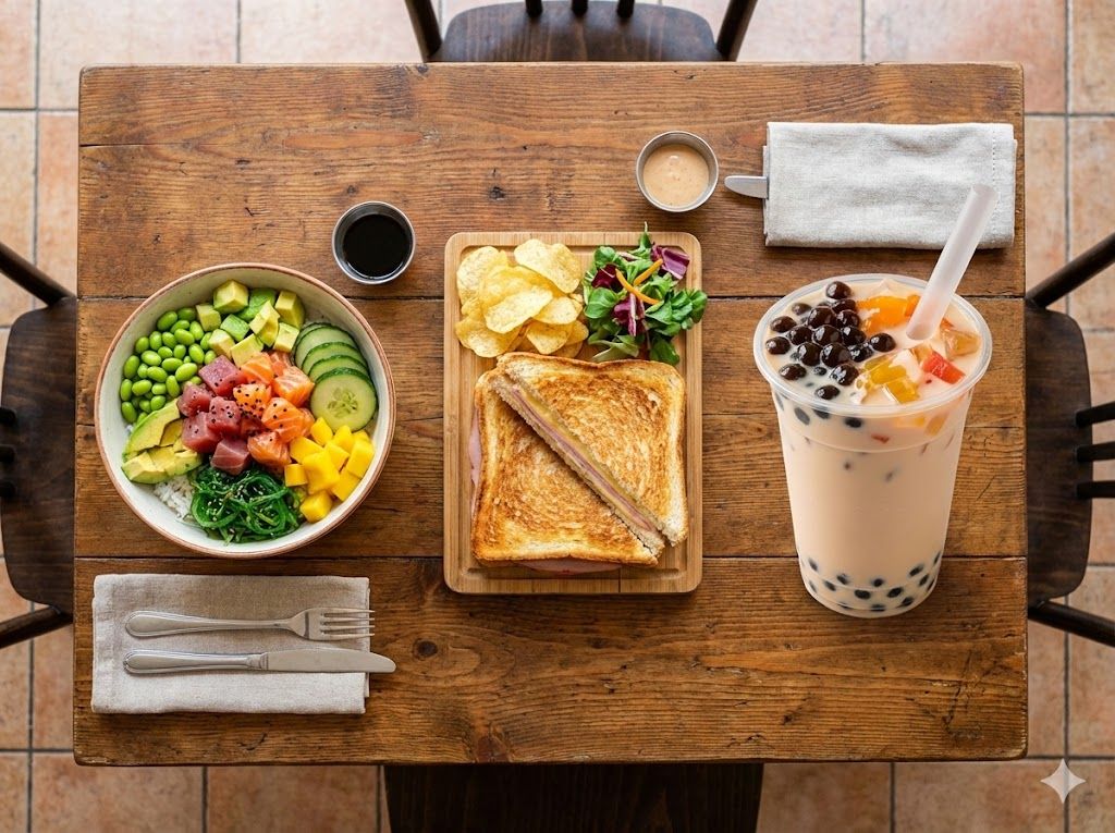 Chá gelado com leite ou fruta, preparado no momento, com pérolas de tapioca ou popping boba.