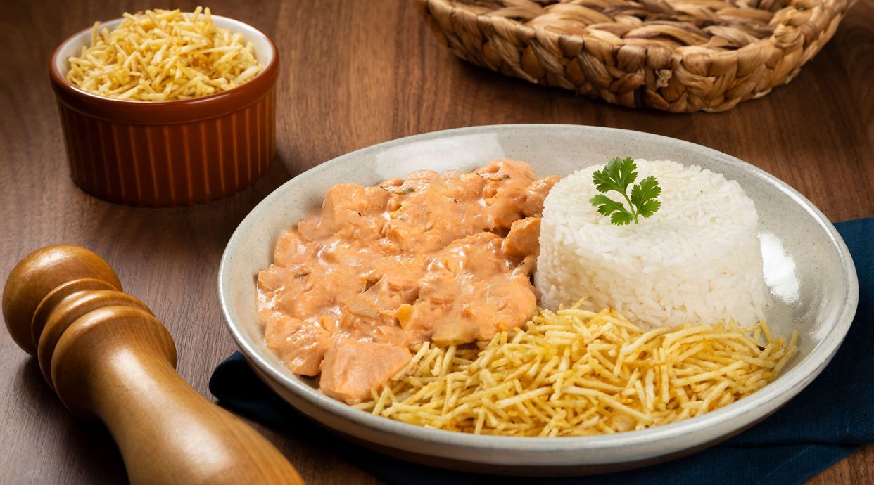 Molho strogobox de frango suculento, arroz especial, batatas palha estaladiças