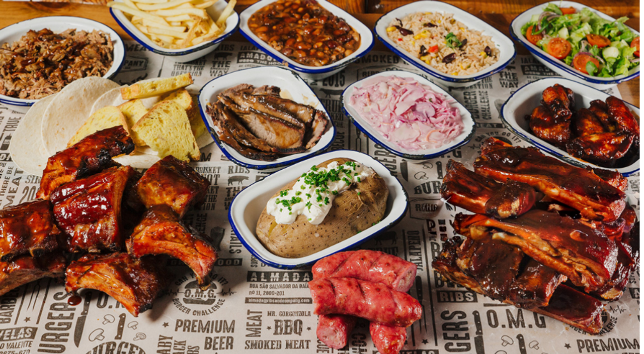 Manta de entrecosto fumada durante 20 horas, salsicha de porco fumada e asinhas de frango fumadas