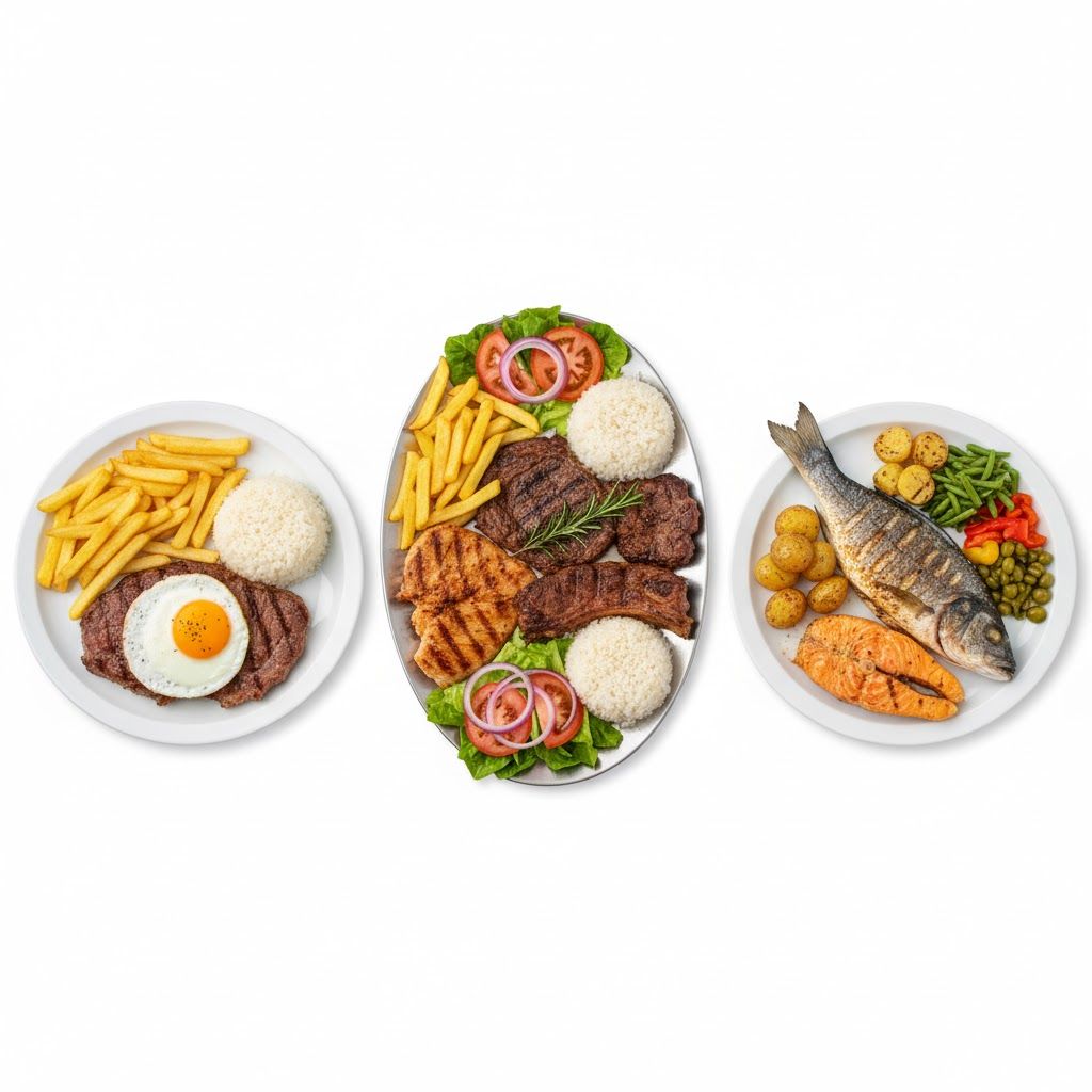 Bife grelhado servido com batatas fritas, arroz e ovo estrelado.