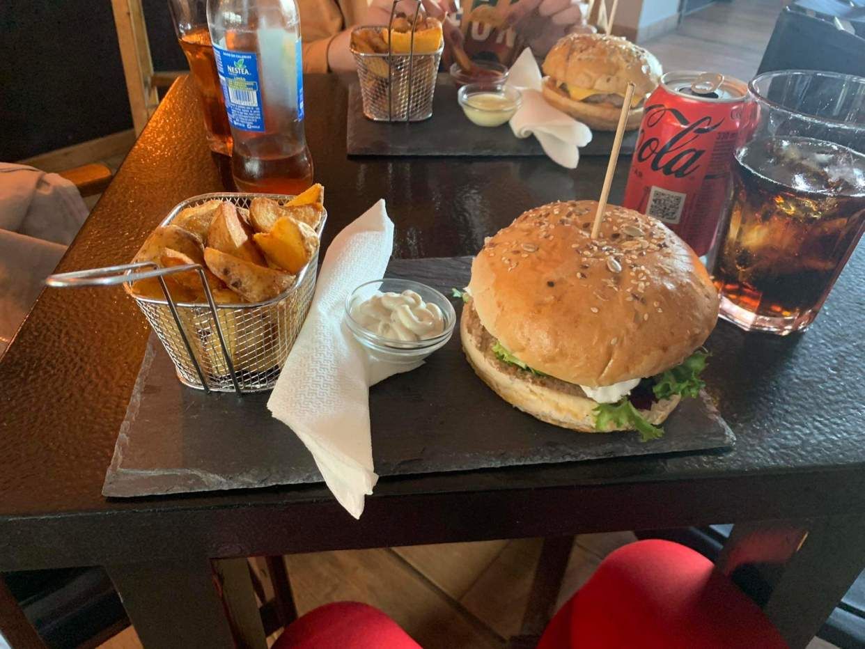 Pão Macio, Alface, Tomate, Hambúrguer Vegetal, Molho Alho e Coentros. Acompanhada com Batatas Fritas.