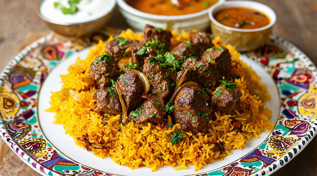 Arroz bashmati frito na frigideira com borrego, fruta secas e especiarias.