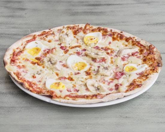 Molho de tomate, mozzarella, cebola, batata palha, ovo mexido, natas e bacon.