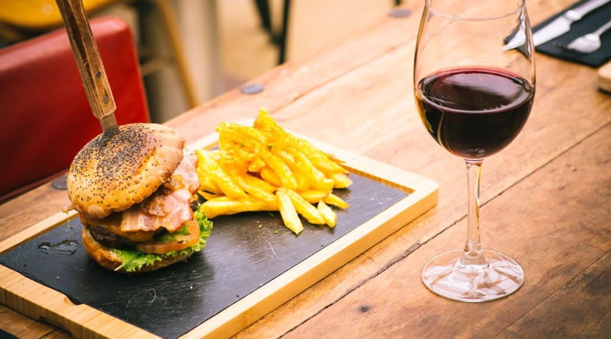 Hambúrguer vegetariano, rúcula, queijo cheddar, cebola caramelizada e tomate, em pão de centeio alemão e com suplemento de batata