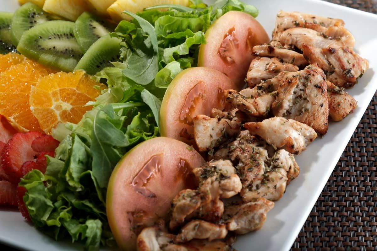 Fruta da época, laranja, abacaxi, maçã, kiwi, melão ou cenoura.