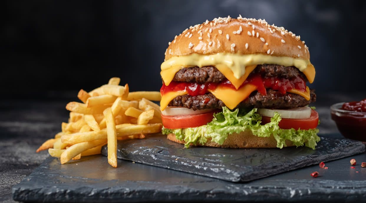 Acompanhado com pão, frango crocante marinado e empanado, cheddar queijo, alface, tomate, cebola roxa fatiada, picles de pepino e molho secreto hambúrguer