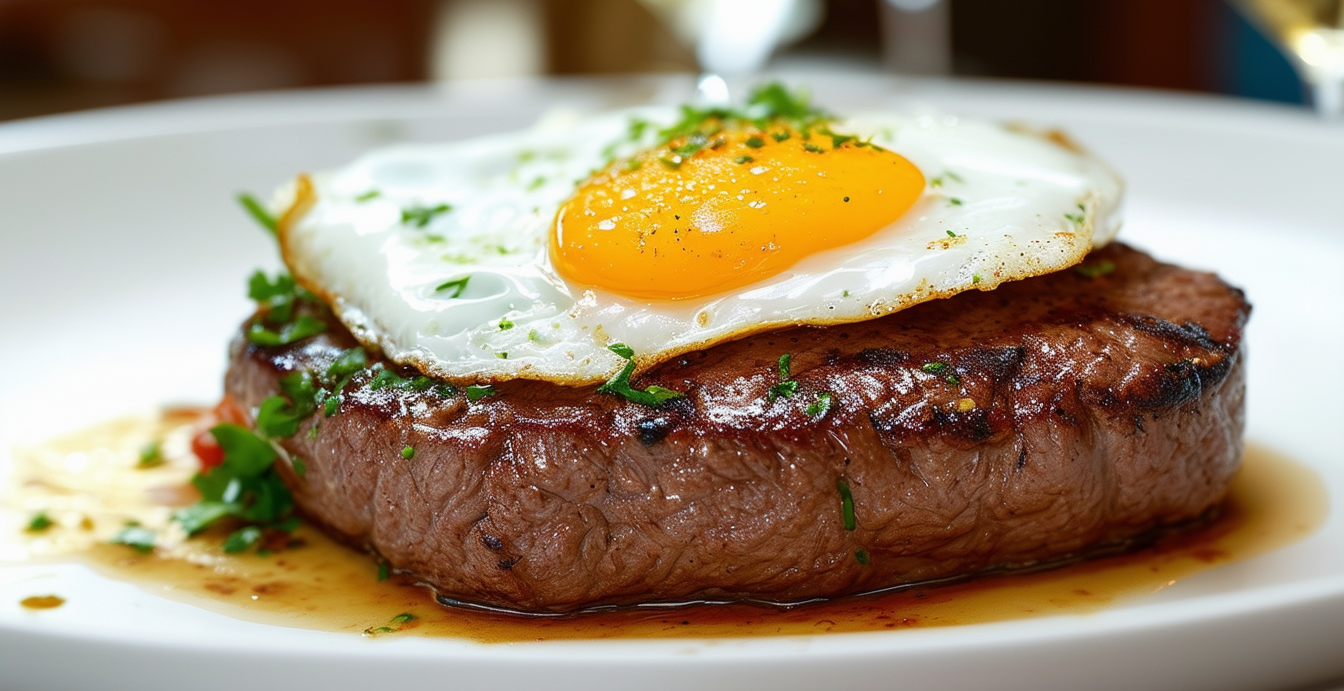 Bife Grelhado, Salsicha Toscana e 2 Ovos Estrelados