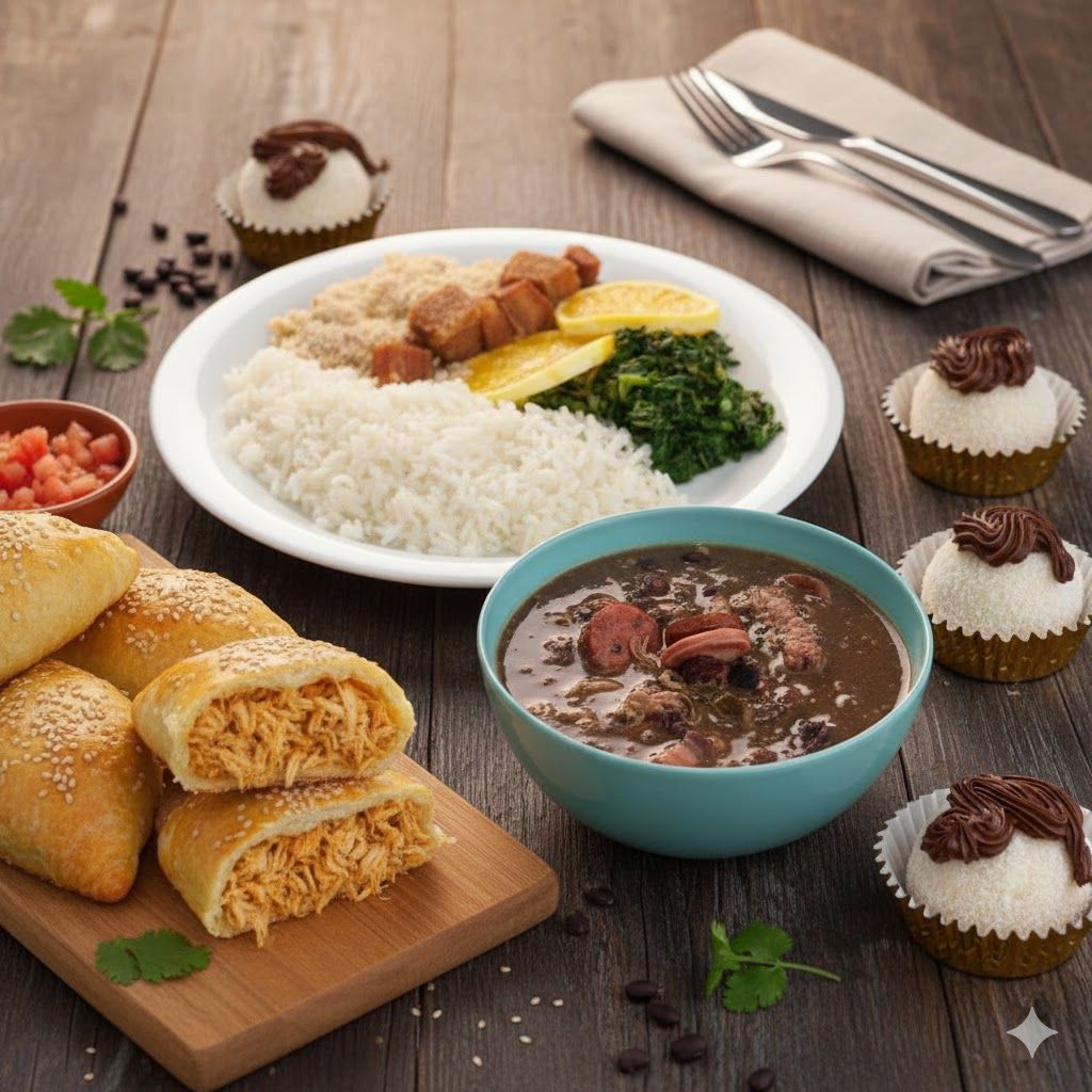 Feijão preto apurado com carnes nobres e muito bacon. Acompanha arroz branco, couve mineira salteada, vinagrete, farofa crocante e fatias de laranja fresca. O sabor autêntico que aquece o coração.