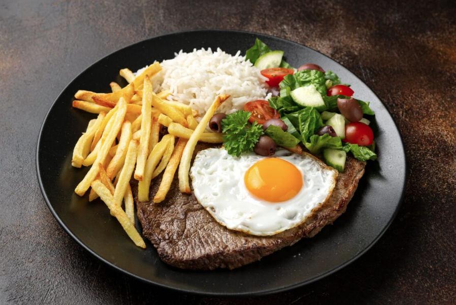 Tres febras grelhadas, com ovo a cavalo, arroz branco e batata frita.