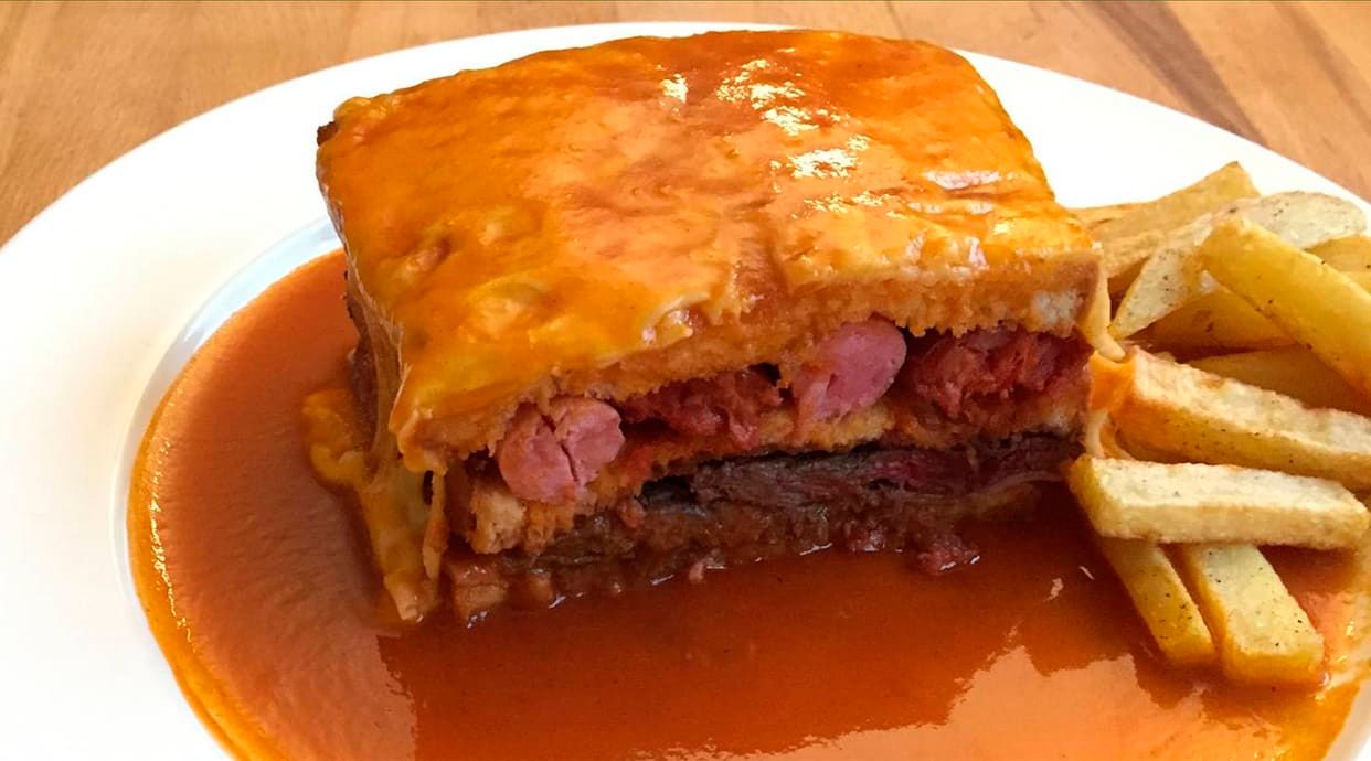 Com queijo e friambre, acompanhado por Batatas fritas e salada