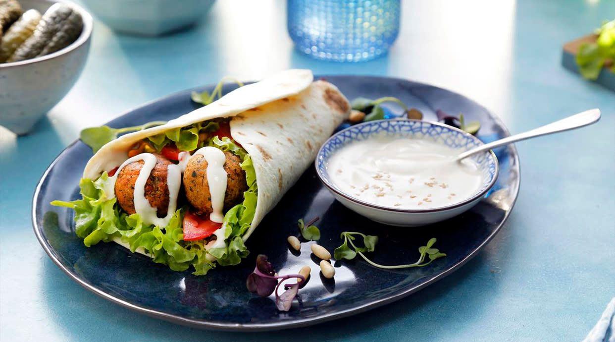 hot n crispy ginger frango ,com salada ,molho com tortilla wrap