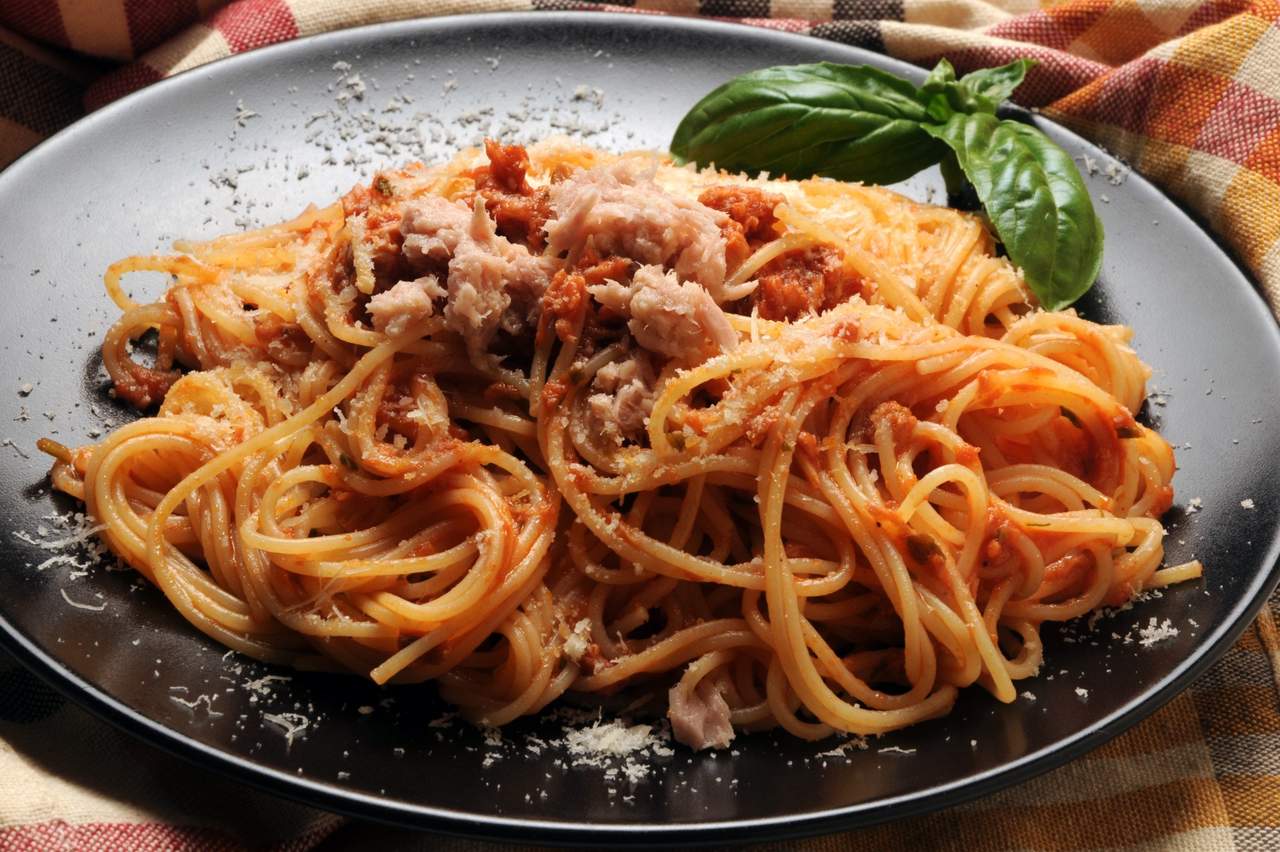 Penne, ton, ceapă, usturoi, capere, vin, piper, roșii cherry, verdeață - 400g