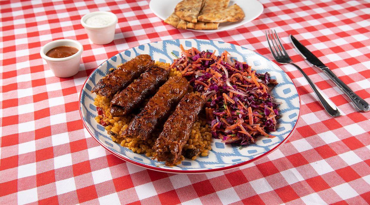 Carne oaie, vita și pui, condimente turcești, bulgur, salată kebab, lipie, sos picant și sos de iaurt. Cantitate la alegere