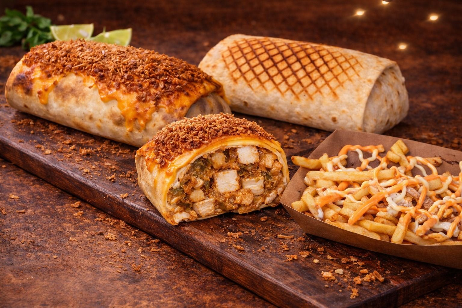 lipie tortilla, sos picant, crispy de pui, cartofi prajiti, sos algerienne, jalapeno, mozzarella Valori nutritionale (exprimate la 100g): Kcal: 280.9, Grasimi: 18.3, Glucide: 16.9, Proteine: 10.9 Alergeni: Cereale care contin gluten (grau, secara, orz, ovaz, grau spelt, grau mare sau hibrizi ai acestora) si produse derivate, Oua si produse derivate, Lapte si produse derivate (inclusiv lactoza), Telina si produse derivate, Mustar si produse derivate
