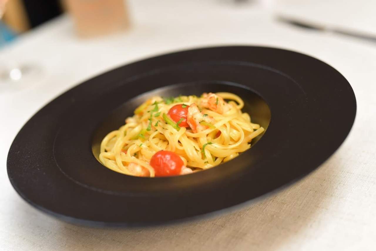 Linguine, dovlecei, roșii cherry, ghimbir, ardei iute, limes, parmezan, creveți, ciuperci shimeji, ulei de măsline - 180g