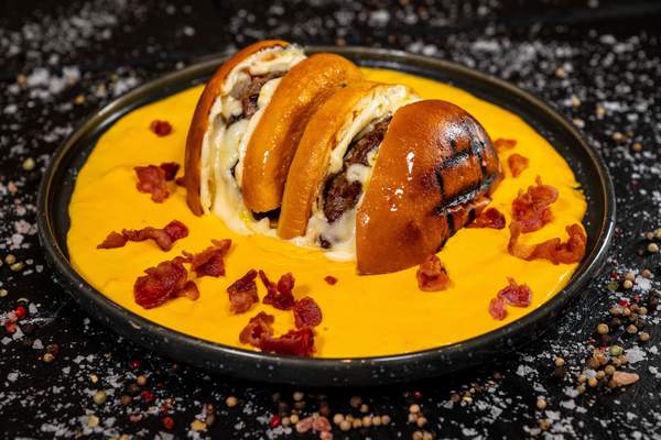 chifla burger, palina vita, mozzarella, castravete murat, ketchup, maioneza, bacon, sos XXL Cheddar + cipsuri de cartofi 600 g TOTAL