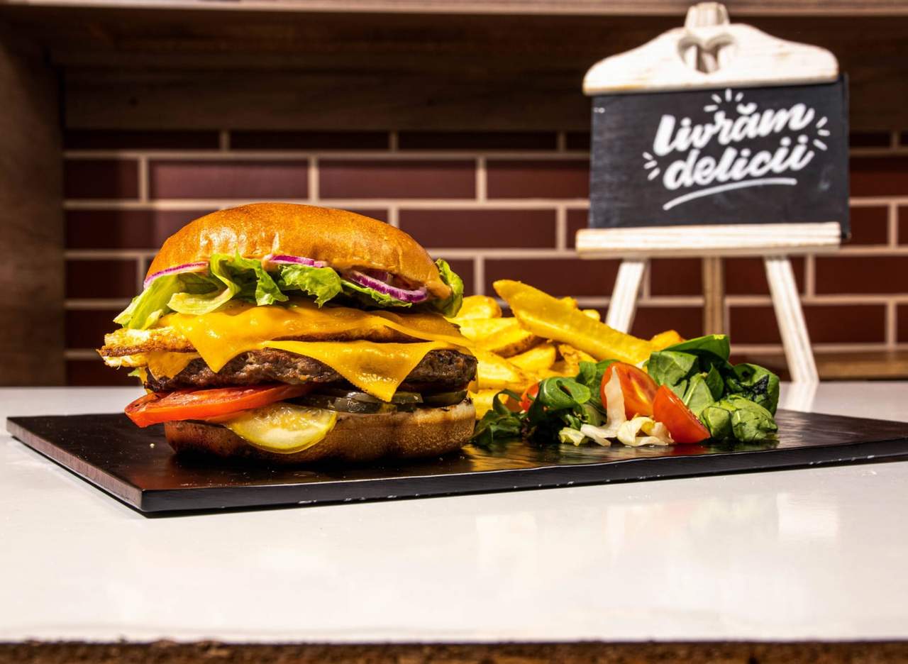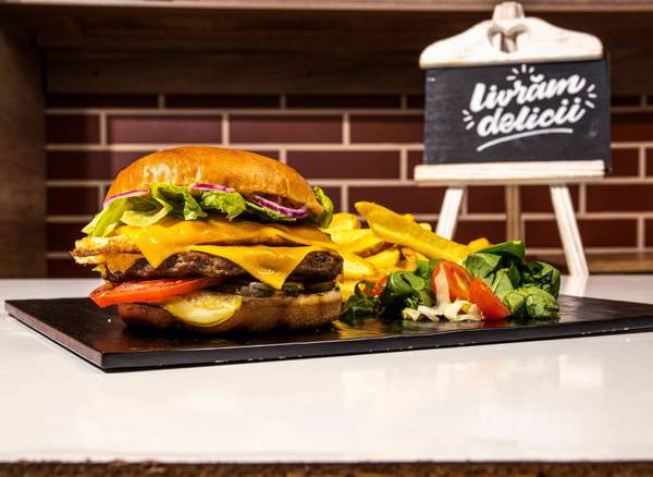 carne de vită black angus, bacon crispy, chiflă cu susan, sos de burger, salată verde, ceapă, roșii, castravete murat 300gr