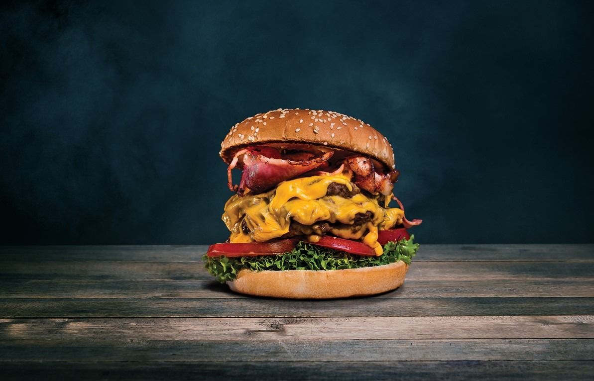 Chiflă artizanală cu mix de susan*, 3 x pastilă carne, cheddar, bacon, salată iceberg, sos BBQ, cartofi fry`n dip, răcoritoare.520 / 170 g / 330 / ml*Conține grăsime de porc