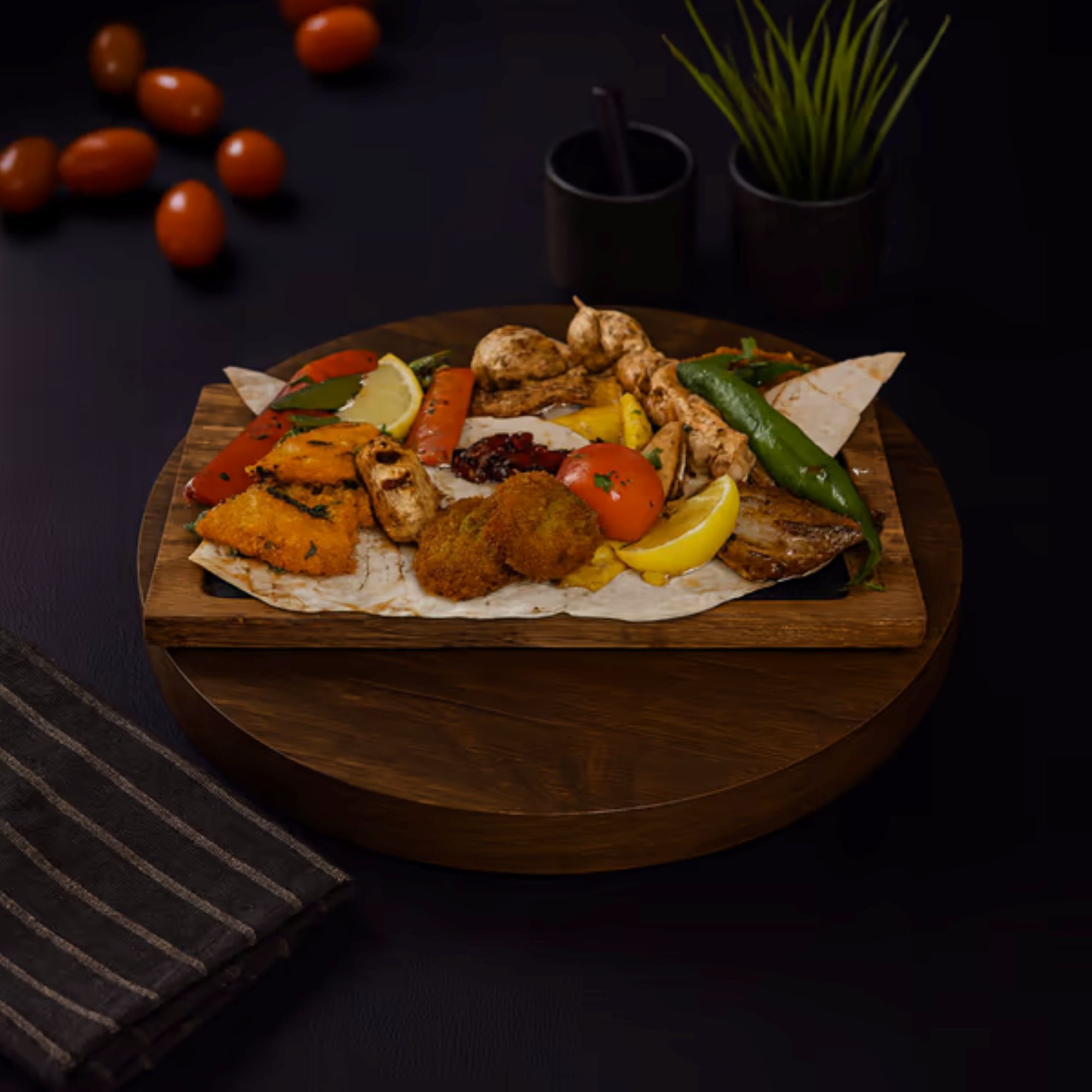 Pentru 2 persoane. Un mix dintre specialitățile noastre: cotlet de berbecuț, kofta kebab, crispy chicken, Istanbul kebab, falafel, hummus cu sfeclă, lipie / bulgur și sos - 750g