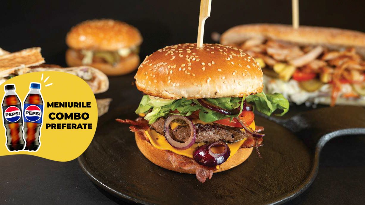Burger de vită, chiflă cu susan, brânză cheddar, roșii, castraveți murați, ceapă roșie, salată verde, ketchup, maioneză simplă, cartofi prăjiți - 500g