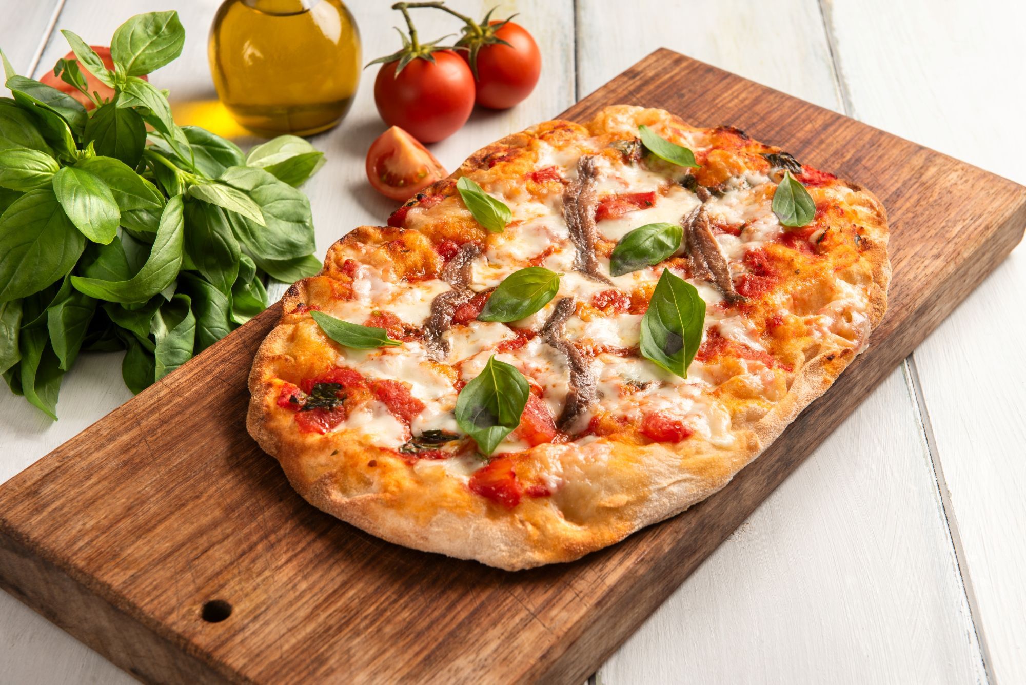 mozzarella Fior di Latte, prosciutto cotto scelto, Grana Padano, măsline verzi, sos de roșii San Marzano, ulei de măsline extravirgin, busuioc