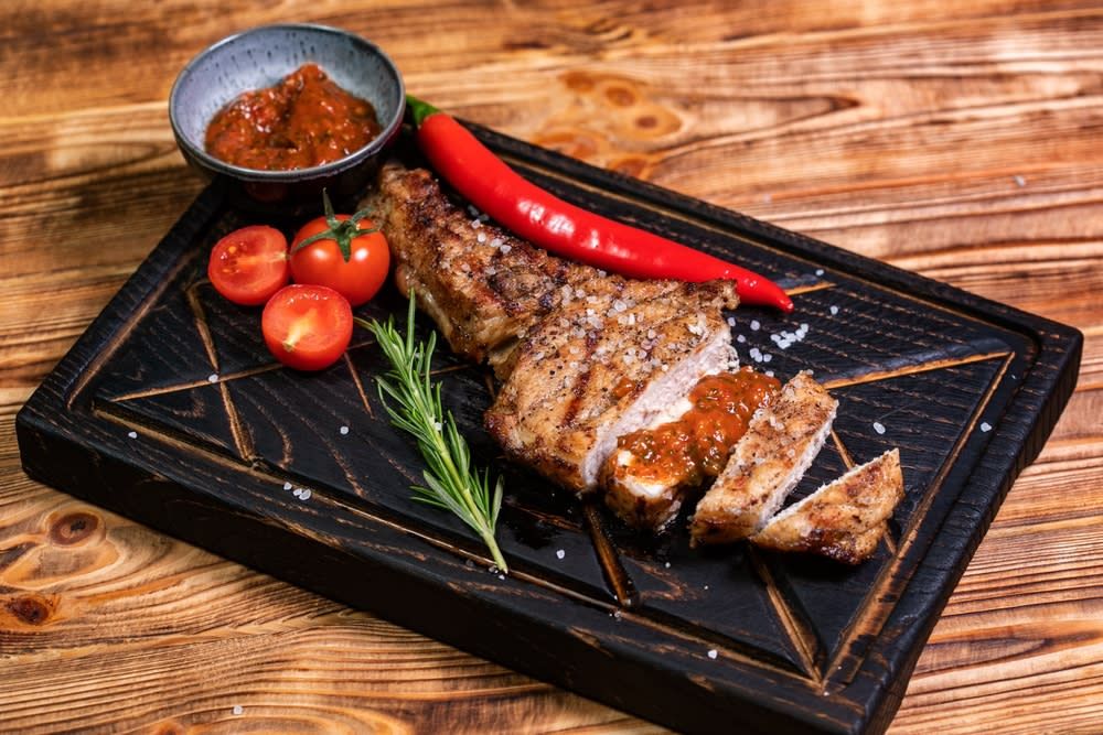 Servită cu mix de salate, legume la gratar, sos 1000 de insule - 500g Cartofi prajiti nu sunt inclusi in preparat.