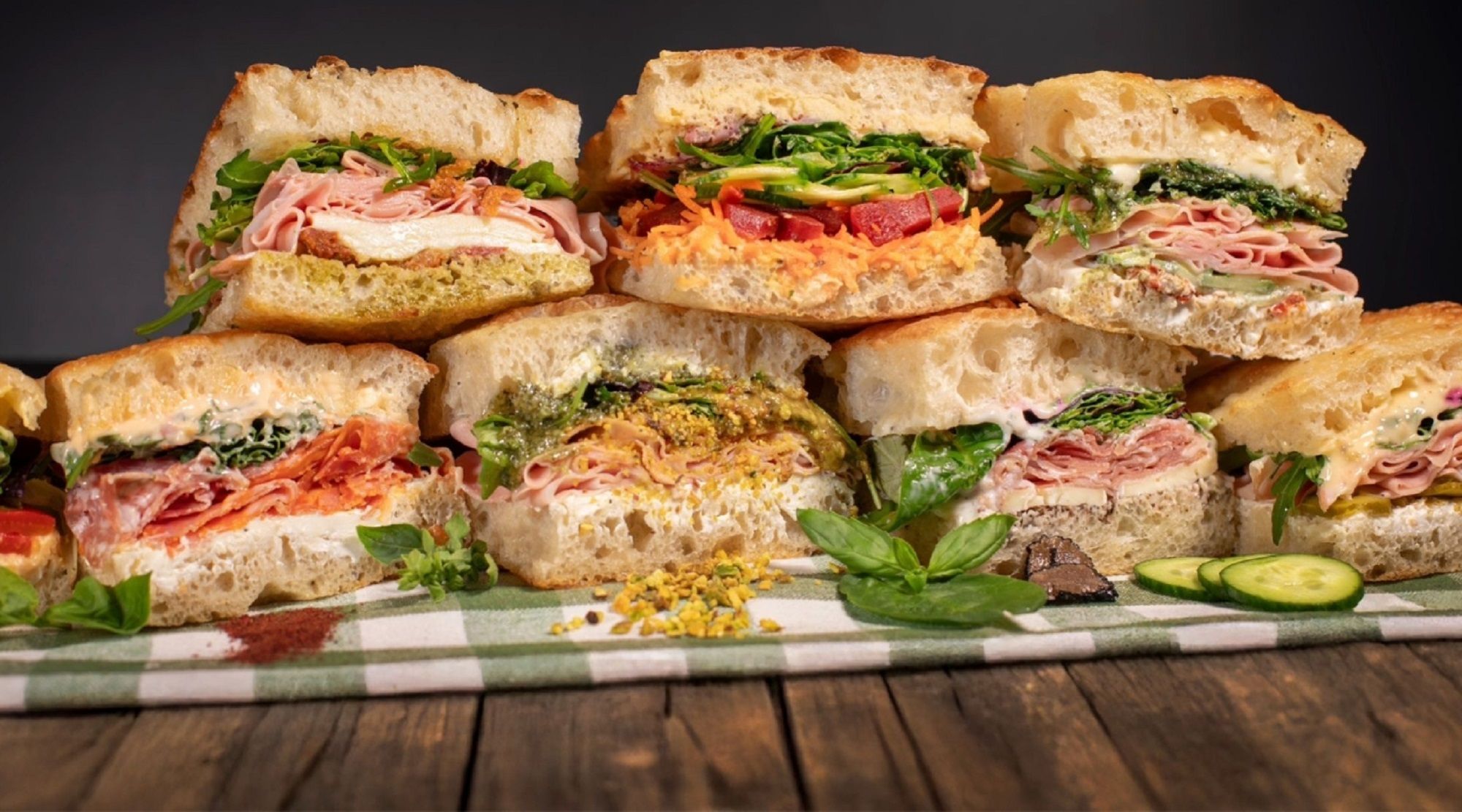 Focaccia coapta azi, prosciutto cotto, crema de gorgonzola dolce, maioneza cu wasabi, pesto de seminte dovleac, rosii uscate in ulei, castravete, rucola - 400-450 g
