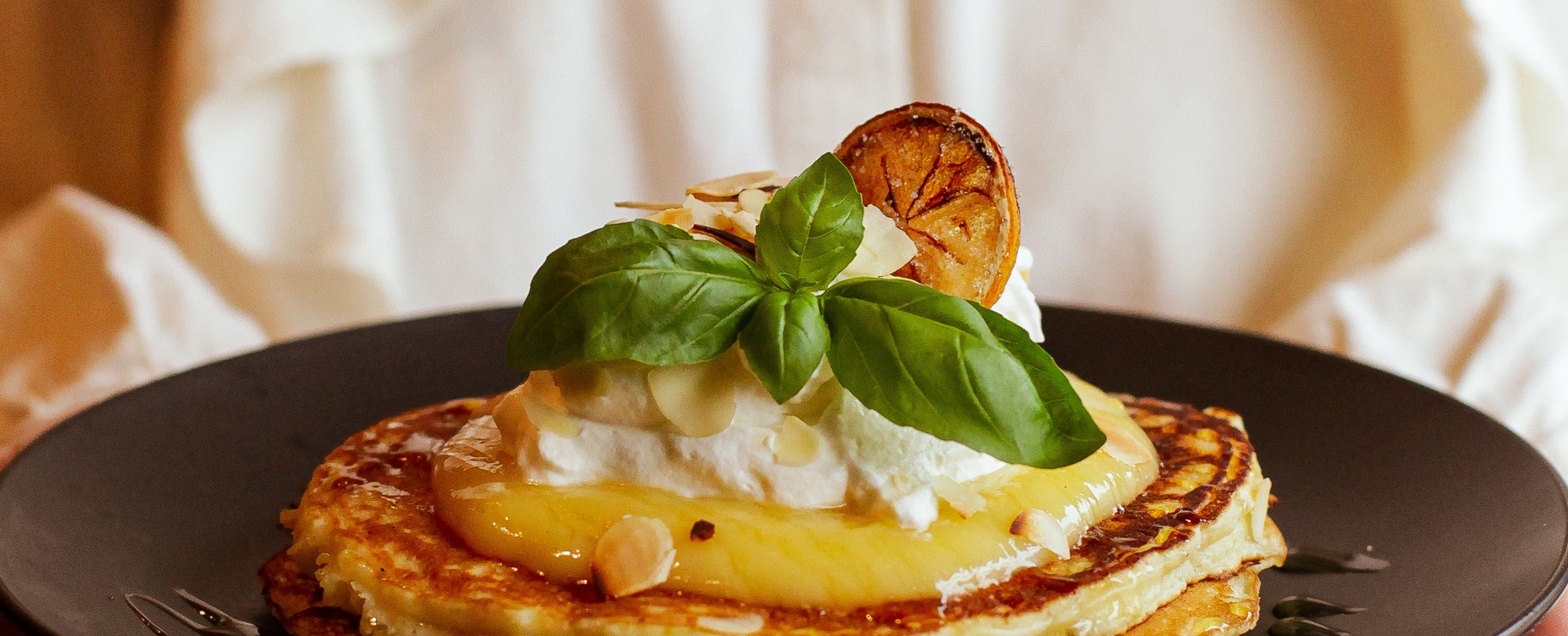 Clătite cu ricotta, frișcă, cremă de lămâie, miere cu busuioc, migdale 280g