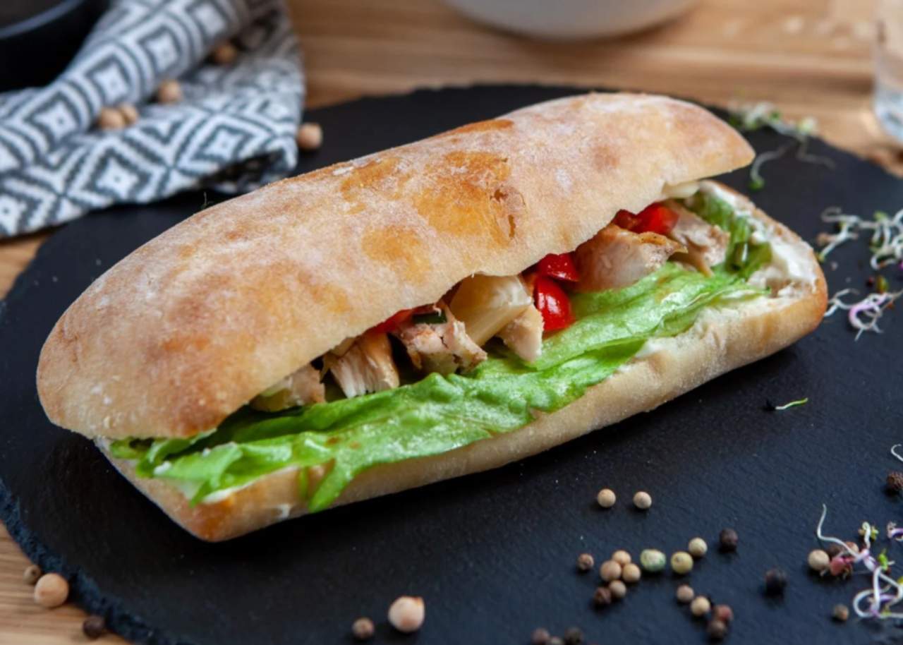 Csirkemell, bacon, paradicsom, cézár szósz, jégsaláta, ciabatta/Piept de pui, bacon, roșii, sos Caesar, salată iceberg, ciabatta - 300g