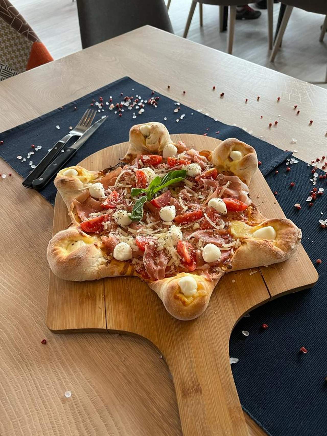 Sos de roșii, bocconcini, prosciutto crudo, roșii cherry, busuioc, parmezan 500gIngredientepalina pizza l (faina alba | alergen: cereale care contin gluten, apa potabila, drojdie uscata, zahar, Sare iodata, ulei de floarea soarelui), bocconcini | alergen: lapte, mozzarella | alergen: lapte, sos pizza l (oregano, busuioc, condiment, zahar, Sare iodata, ULEIDE MASLINE, piper negru), rosii cherry, prosciutto crudo l | aditivi: Alți aditivi/E 252, cascaval | alergen: lapte, branza dura l | alergen: lapteValori nutriționaleValori nutritionale / 100g Valoare energetica: 246.10 kCal / 1032.97 kJ | Grasimi: 10.36 g | acizi grasi saturati: 4.00 g | Glucide: 25.17 g | Zaharuri: 6.64 g | Proteine: 13.05 g | Sare: 1.55 gAlergeniCEREALE CARE CONTIN GLUTEN,LAPTE