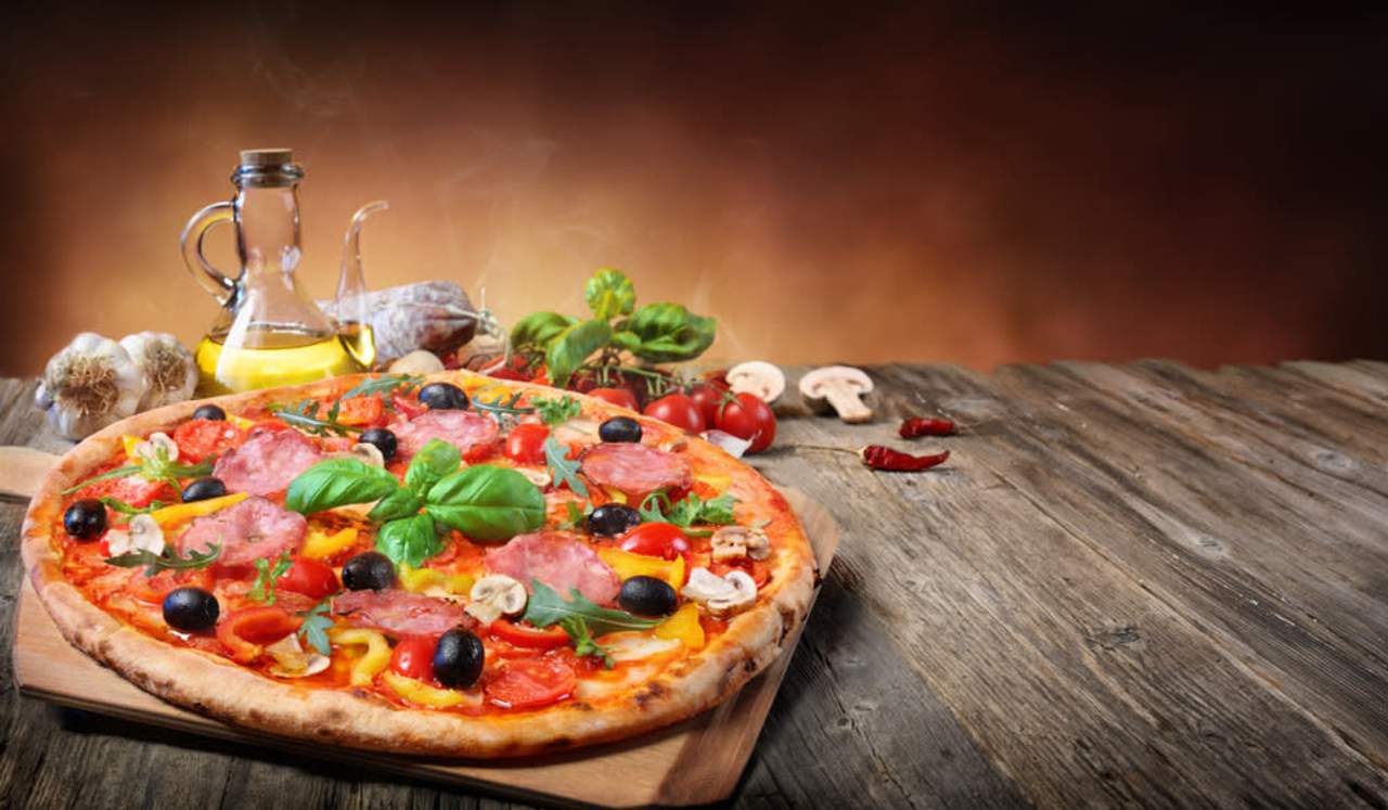 Aluat, sos rosii, fior di latte, gorgonzola, salam napoli, prosciutto cotto, ciuperci, ceapa rosie, 500 gr