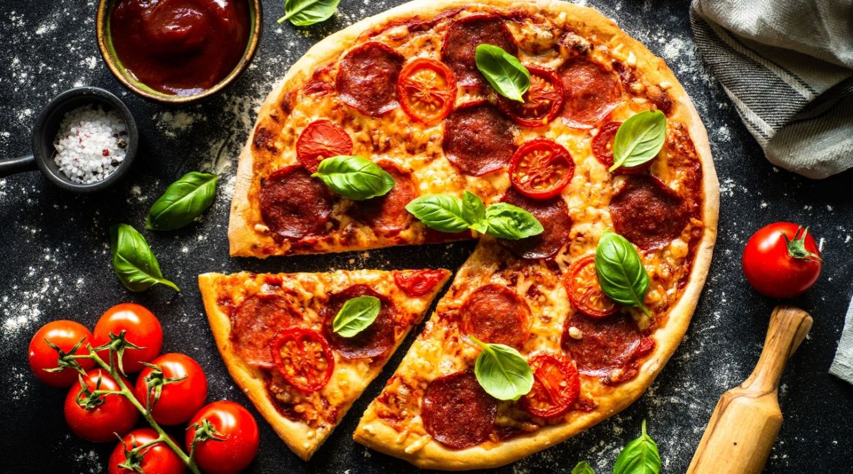 Aluat pizza, mozzarella, sos pizza, prosciutto cotto, pommodori sechi.
