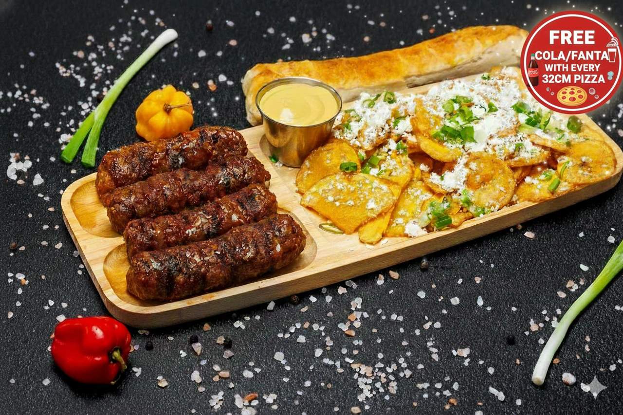 Cascaval pane, piept de pui la grătar, ceafă de porc, cartofi pai proaspeti, brânză rasă, ceapă verde, sos de usturoi - 960g