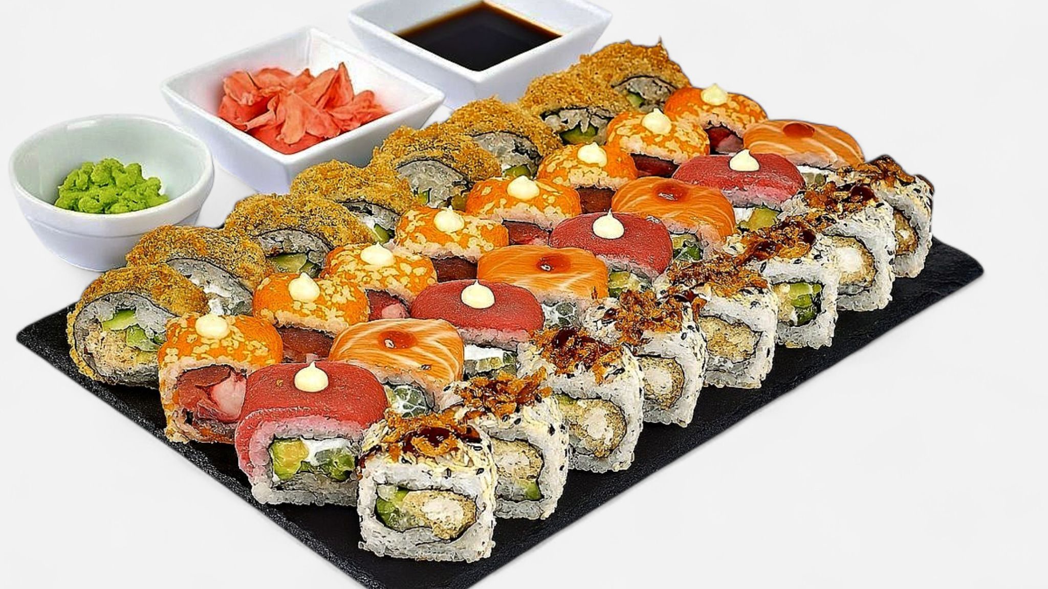 Philadelphia somon, Japan classic, Tempura somon, Japan flambe somon - 32buc. Ghimbir, wasabi, sos de soia si bete incluse. Cca 980 g.