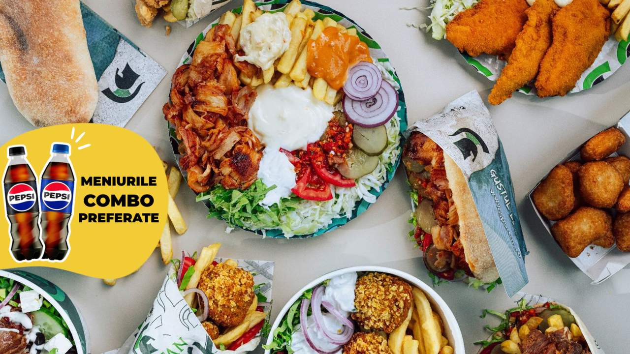 Cartofi prăjiţi, carne rotisată amestec (vițel, purcel, berbecuț), salată de varză, sos usturoi, sos dulce-acrişor, sos legume, sos tzatziki, roşii, castraveciori muraţi, ceapă, salată verde + bautura la alegere - 705g + 330ml